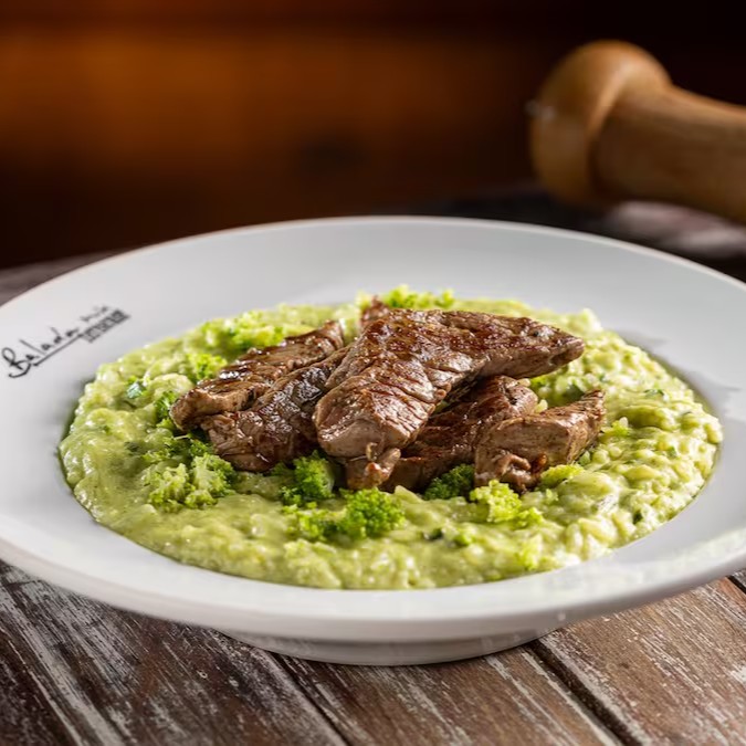 Baby Beef super macio servido c/ Risotinho de Brócolis e Grana Padano.