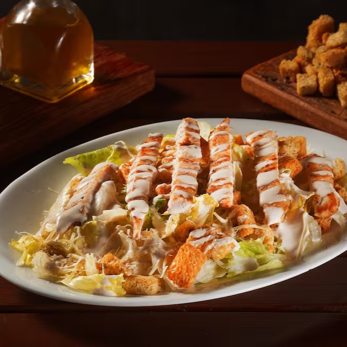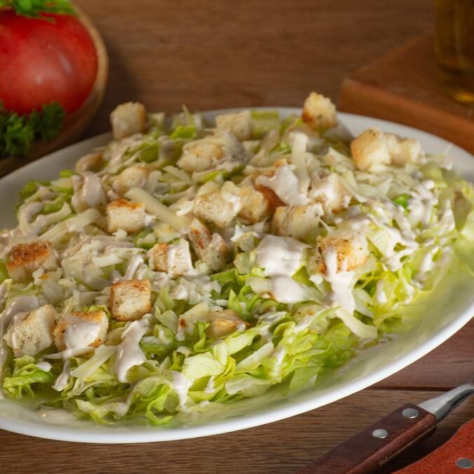 Salada Caesar com Alface Americana, croutons crocantes e Parmesão, tudo harmonizado com o autêntico Molho Caesar Tradicional.