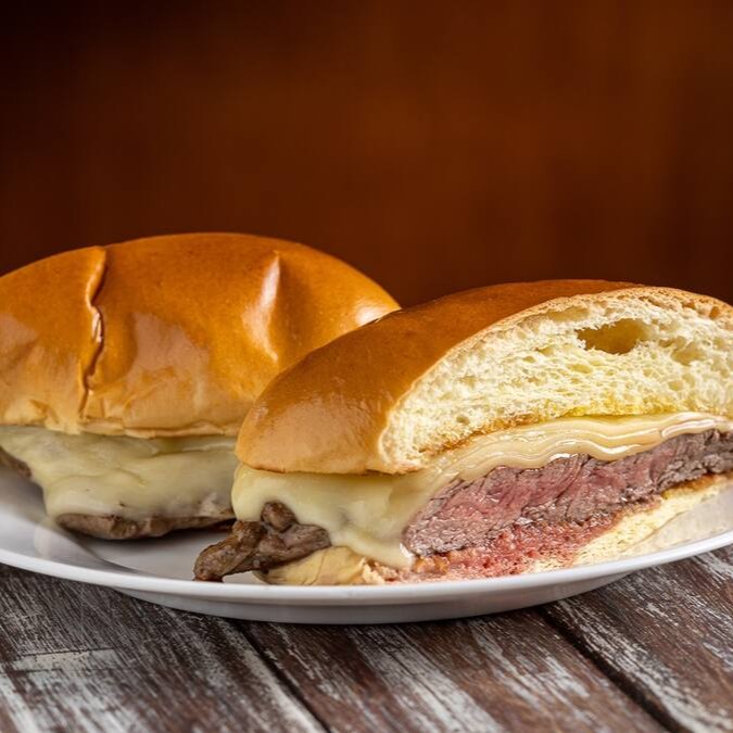 Sanduiche com Filé mignon grelhado e suculento e saboroso, queijo prato derretido e cremoso, alface crocante e tomate fresco se unem em um pão macio
