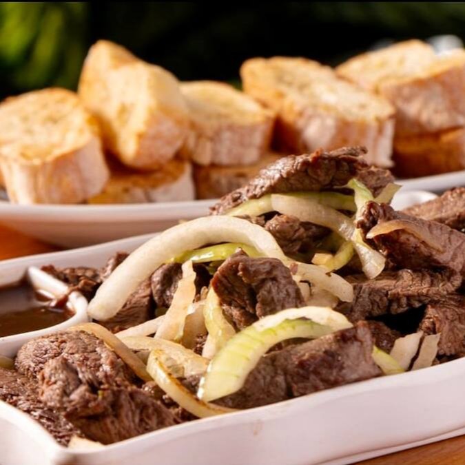 Tiras de mignon acebolado com molho madeira, acompanhadas de torradas de pão ciabatta.