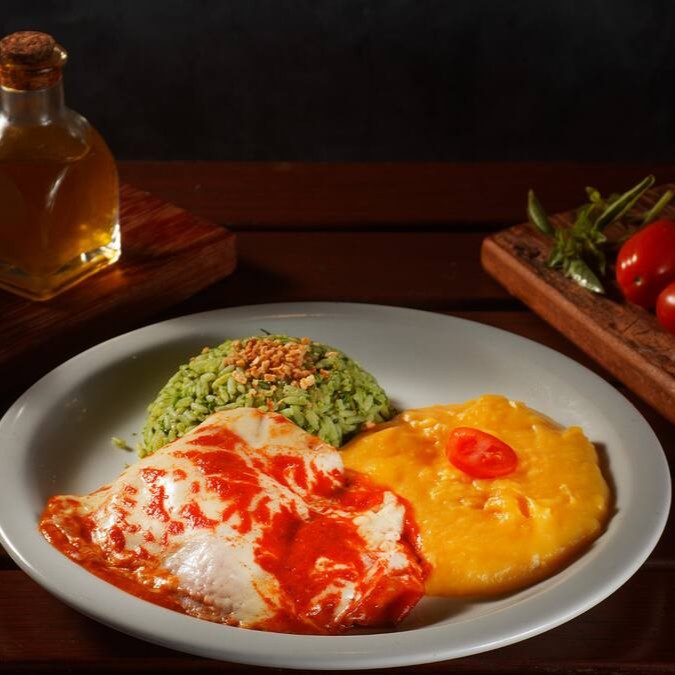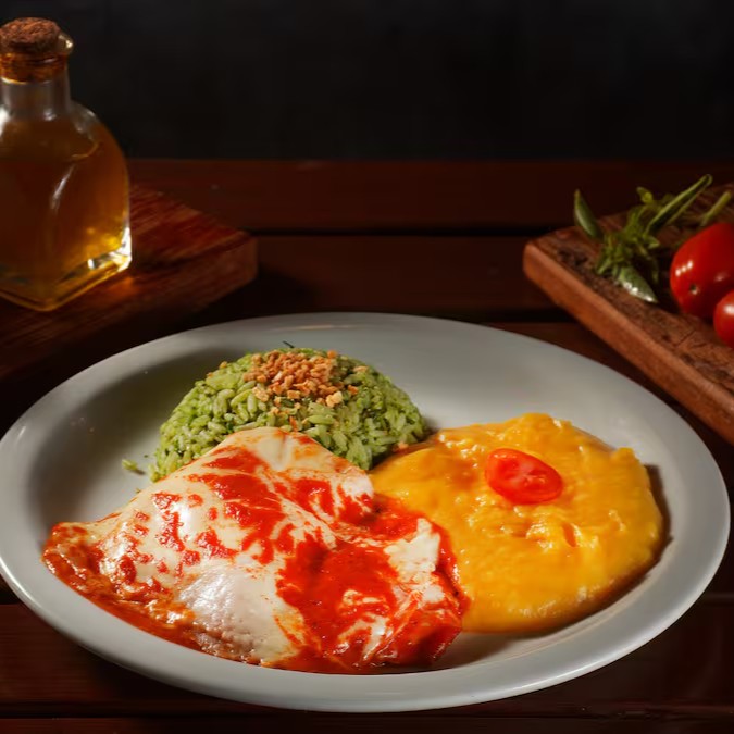 Prato refinado e reconfortante, apresentando uma harmoniosa combinação de filé suculento, acompanhado de arroz de brócolis, que adiciona frescor e sabor vibrante, e purê de batata baroa, conferindo uma textura cremosa e um toque aveludado à refeição.