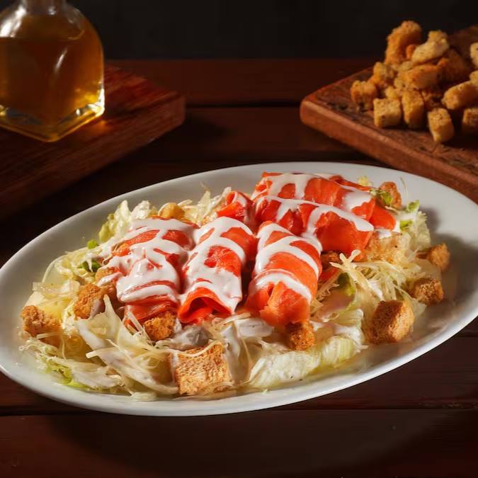 Salada requintada com salmão defumado, alface americana crocante, croutons dourados e generosas lascas de parmesão, harmonizada com o clássico molho Caesar.