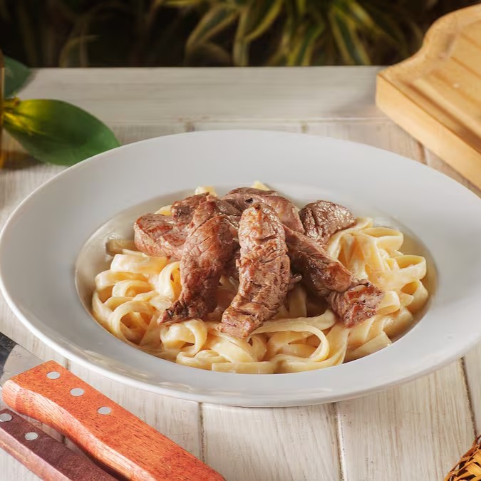 Tiras suculentas de baby beef e massa fettuccine banhados em um cremoso molho alfredo. Perfeita para satisfazer pequenas fomes.