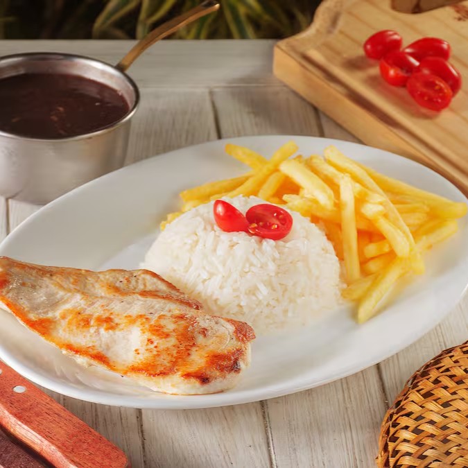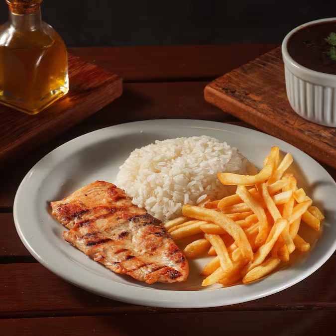 Franguinho grelhado, suculento e cheio de sabor, harmonizado com arroz soltinho, feijão caseiro e batata frita crocante. Uma refeição balanceada que agrada a todos os paladares.