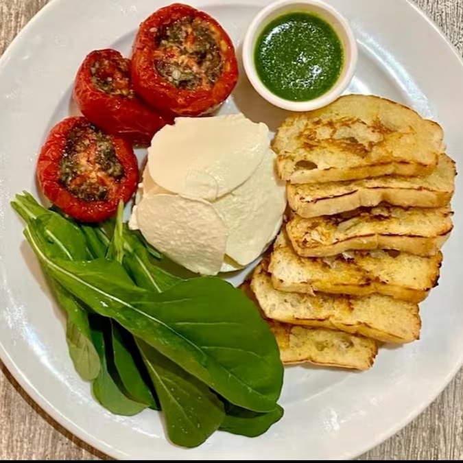 Entrada do balada mix com tomate seco, mussarela de búfala, Folhas de Rúcula Frescas, Molho Pesto e Torrada de Pão Ciabatta.