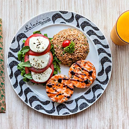 Escolha entre o arroz integral ou o arroz com shiitake, acompanhando nosso Medalhão de Salmão e uma salada caprese com rúcula, a combinação perfeita de sabores frescos e saudáveis.