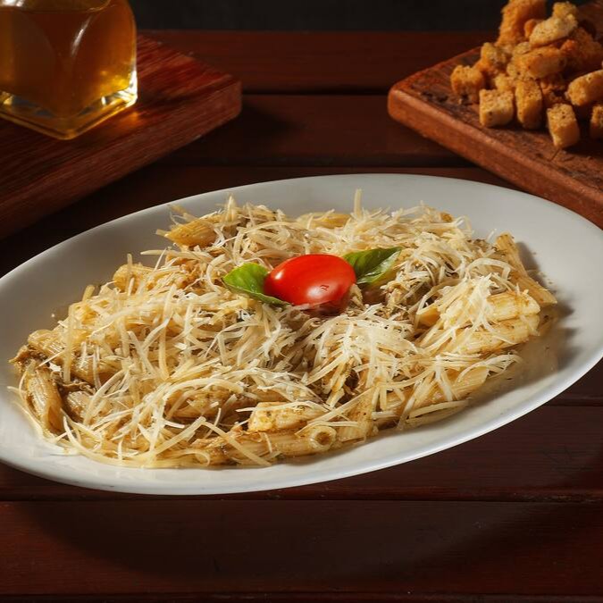 Macarrão Penne com Molho pesto aromático, acompanhado por frango desfiado suculento e finalizado com uma generosa camada de queijo parmesão.