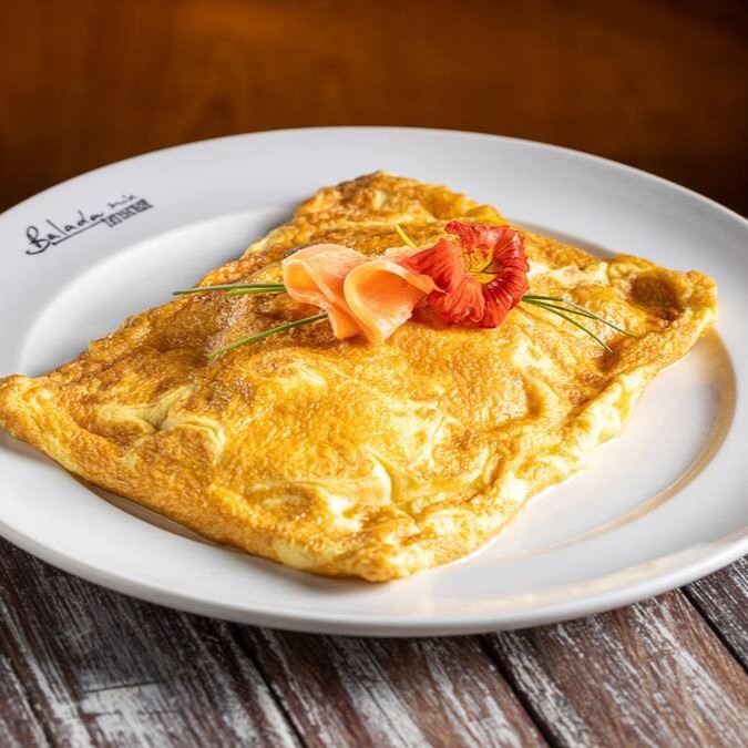 Perfeito Omelete recheada com maravilhosos pedaços de frango, queijo meia cura derretido e o toque perfumado do alho-poró.