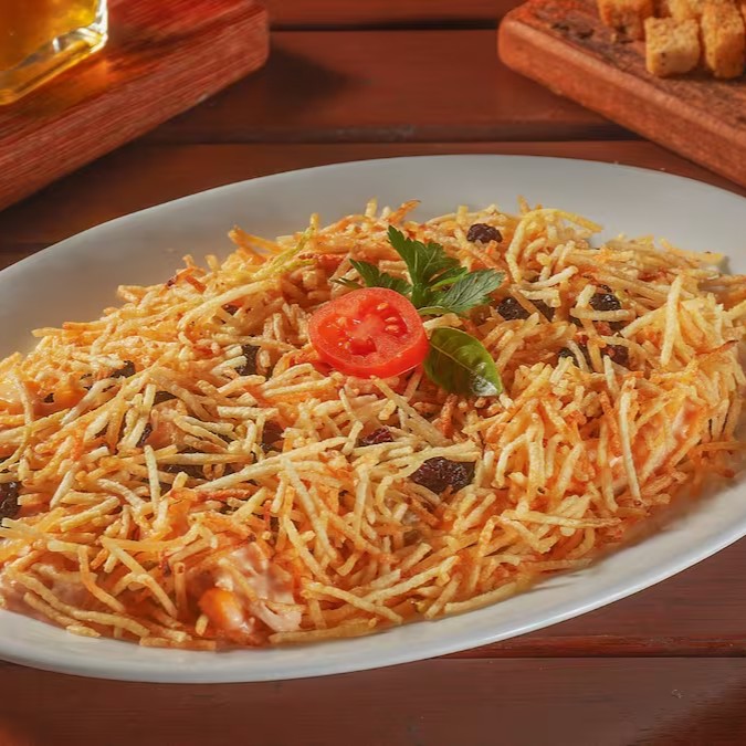 Salada de frango desfiado, cenoura crocante, passas suculentas, ervilhas e milho, finalizada com a textura irresistível da batata palha.