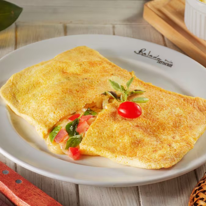 Omelete recheada com queijo Prato derretido, tomates frescos e manjericão aromático. Que resulta em uma explosão de sabores cremosos e frescos