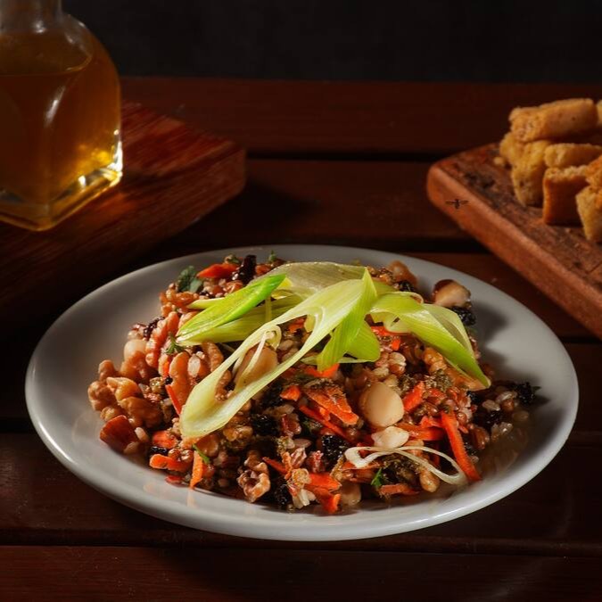 Preparada com Arroz Cateto Integral, Trigo em Grãos, Cenoura Ralada, Passas, Castanha do Pará, Nozes, regada com o saboroso Molho Pesto e finalizada com o toque especial do Alho-Poró. Uma explosão de texturas e sabores saudáveis.