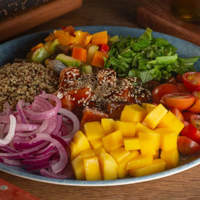 Quinoa em grãos, salmão cru ao molho oriental, coberto com gergelim torrado, legumes assados, manga, tomate cereja e cebola roxa