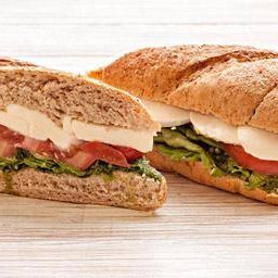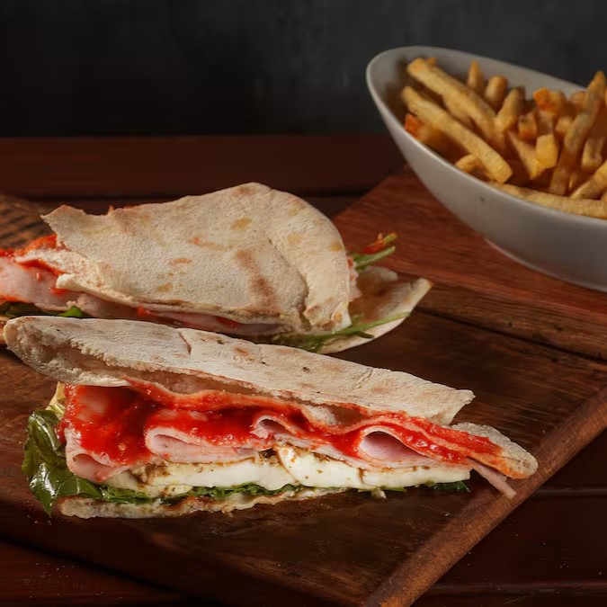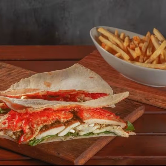 Saboroso sanduíche com blend de quinoa, envolto em macio pão árabe, complementado pela frescura da rúcula e a intensidade do molho pesto.