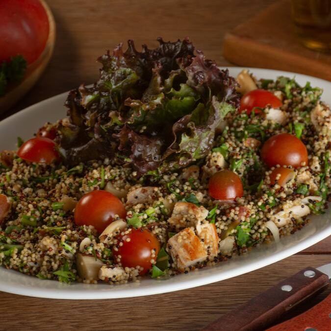 Filé de mignon grelhado, acompanhado por uma leve salada de quinoa, tomatinhos suculentos e rúcula fresca, regada com um molho de alho e ervas
