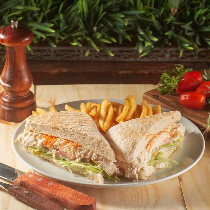Sanduiche de Frango desfiado, suculentas passas pretas, toque especial do molho rosé, milho verde crocante, cenoura ralada e azeite extra virgem se unem em um pão macio para uma explosão de sabores!