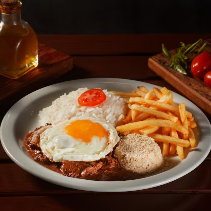 Prato completo e delicioso, acompanhado de arroz soltinho, farofa crocante, batatas fritas douradas, ovo perfeitamente preparado e regado com um irresistível molho madeira. Uma combinação que satisfaz todos os sentidos, oferecendo uma experiência gastronômica repleta de sabores e texturas.