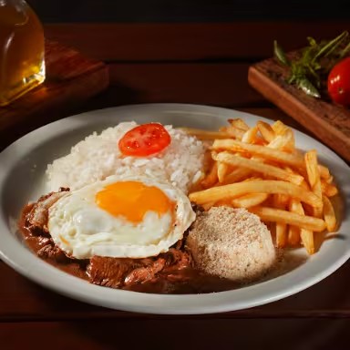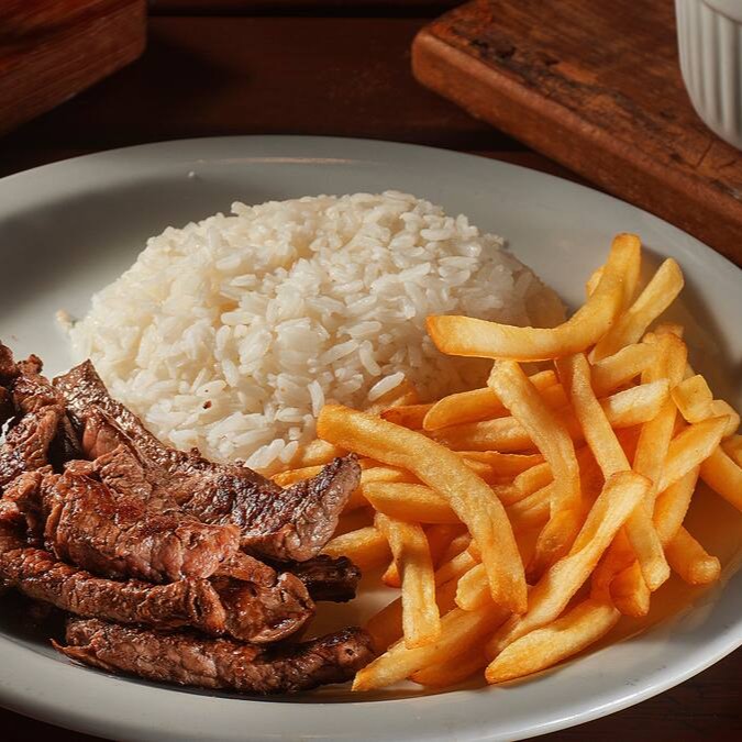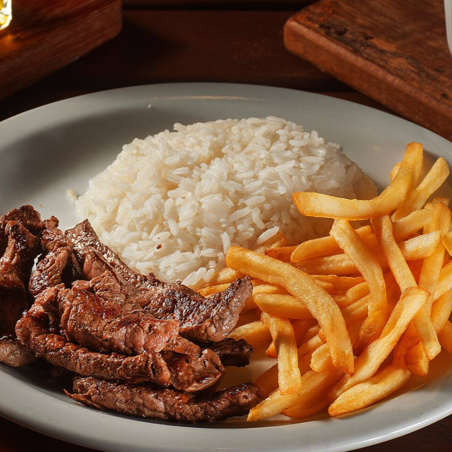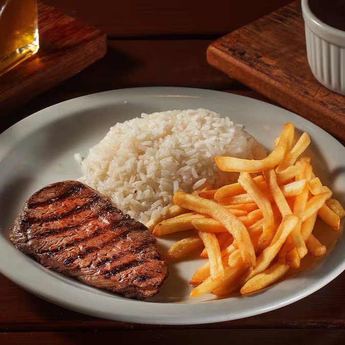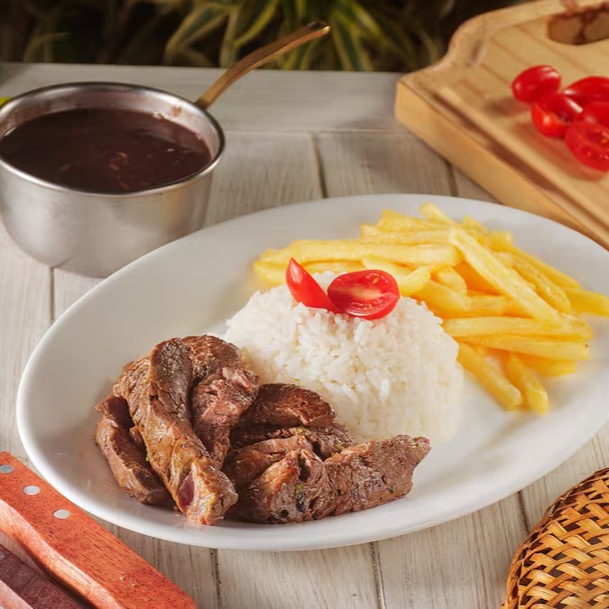 Filé Mignon suculento, arroz, feijão, batatas fritas e escolha entre farofa ou uma refrescante salada. Um banquete que atende a todos os gostos!
