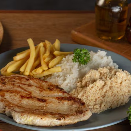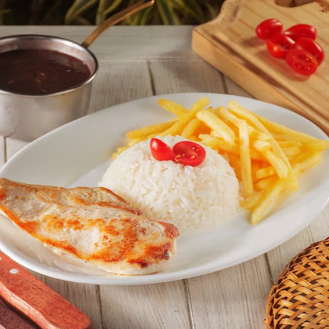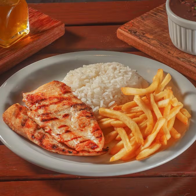Delicioso prato de Filé de Frango, acompanhado por arroz, feijão, batatas fritas e escolha entre farofa ou uma refrescante salada. Uma refeição que agrada a todos os paladares!