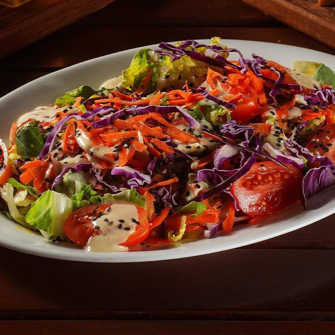 Alface americana, rúcula, cenoura, acelga, repolho roxo, tomate cereja, molho ranch e gergelim.