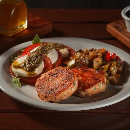 Saboroso e saudável Medalhão de Salmão acompanhado de Arroz Integral e Salada Caprese.