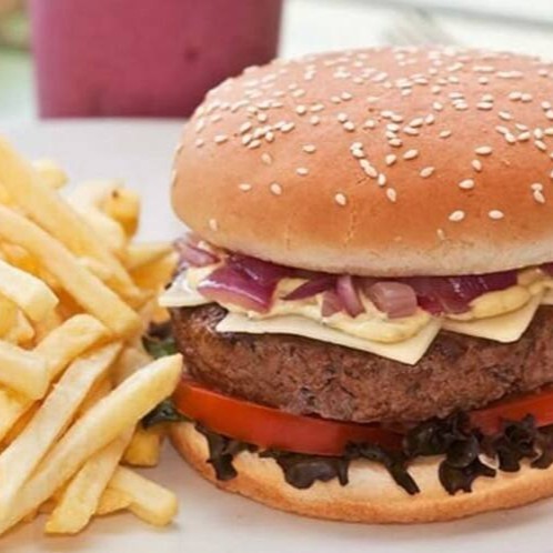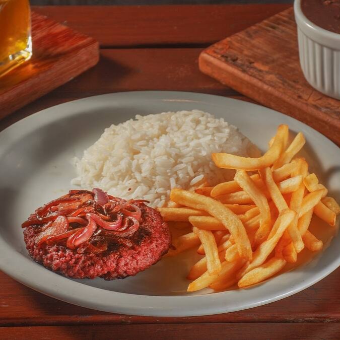 Burguer de fibra de caju, pimenta assisti, cebola, alho, sal, extrato de açaí e beterraba em pó com arroz, feijão, fritas, farofa ou salada