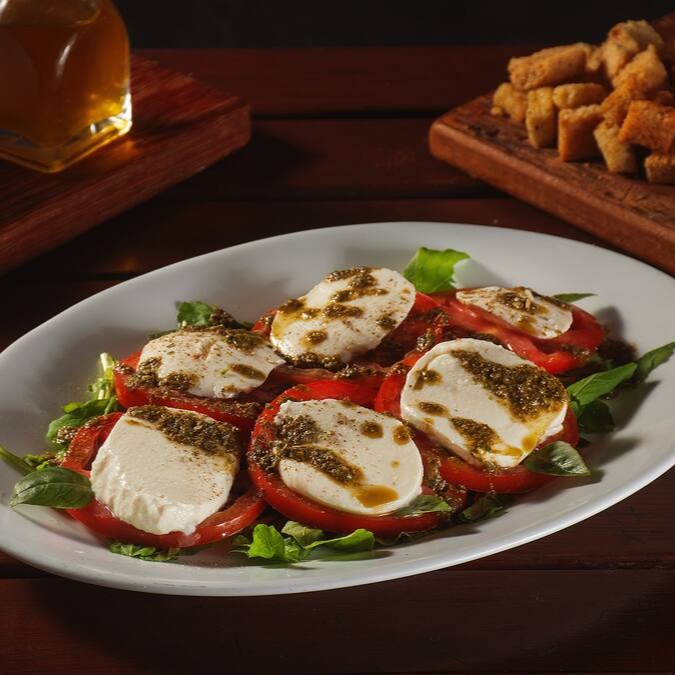 Salada Refrescante com Rúcula, Tomate, Mussarela de Búfala, Orégano e Manjericão ao Molho Pesto.