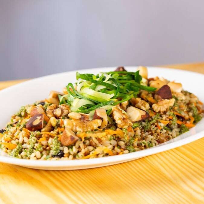 Salada Nutritiva e Saborosa com, Arroz Cateto Integral, Trigo em Grãos, Nozes, Castanha do Pará, Alho Poró e Molho Pesto Artesanal.