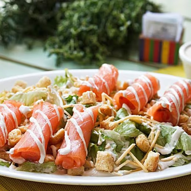 Salada refrescante com alface americana, croutons crocantes, queijo parmesão em molho Caesar e tiras de salmão defumado. Um encontro de sabores que vai te surpreender!