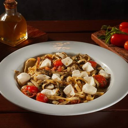 Deliciosa Massa Fettuccine ao Molho Pesto, com Tomate cereja, Mussarela de Búfala e Manjericão. Aquela comida de restaurante com sabor de comida caseira! Ótima para o seu almoco ou jantar! Não é marmita e nem quentinha.