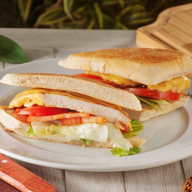 Sanduíche feito com Filé de Frango, Queijo Prato, Alface e Tomate.