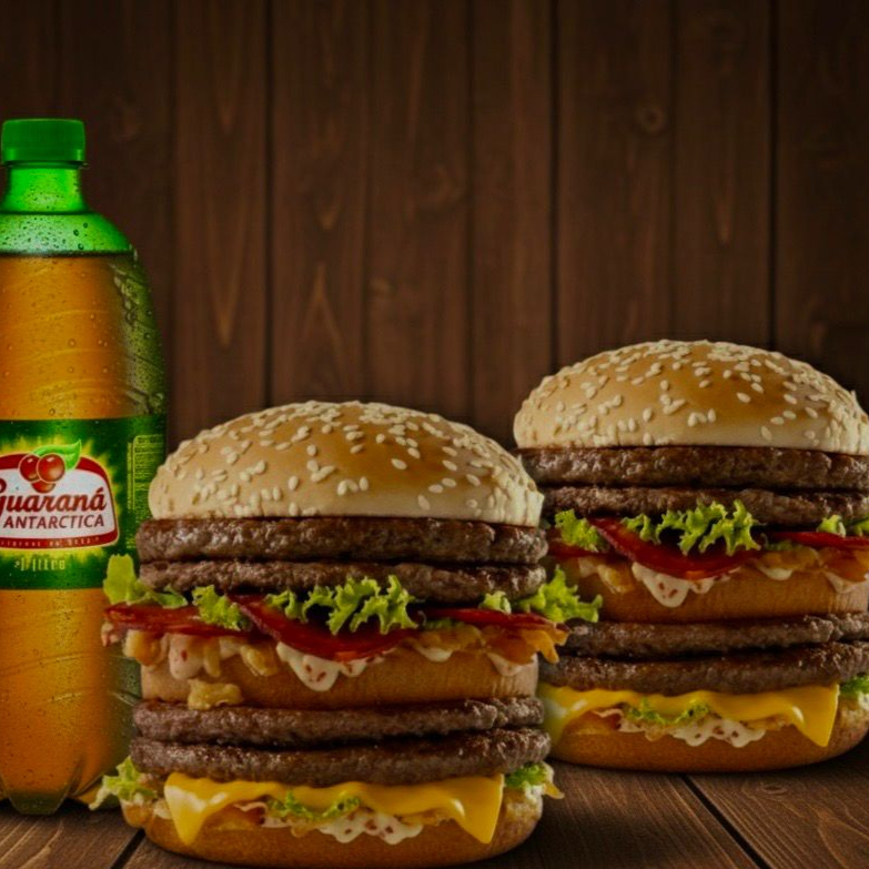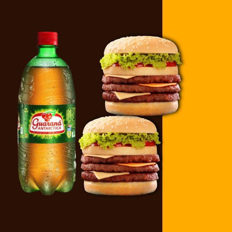 2 hamburgueres (Pão, 1 Carne, Cheddar, Cebola Caramelizada, Bacon, Calabresa, batata palha e requeijão Batata: Bacon, Calabresa, Cheddar e Orégano Refri de 1l