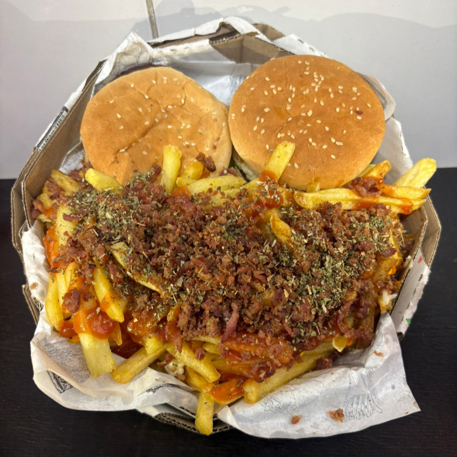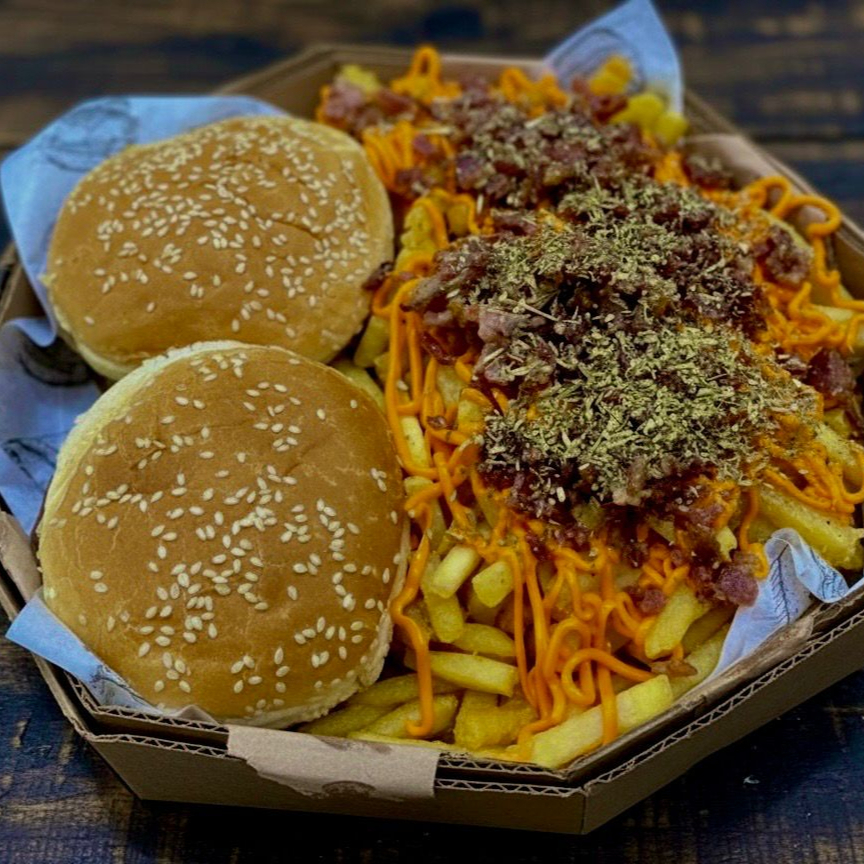 2 Hambúrguer (Pão, ovo, carne, salada, ketchup, queijo, presunto, requeijão, maionese de alho e batata palha) Batata (Cheddar, bacon, calabresa e orégano)