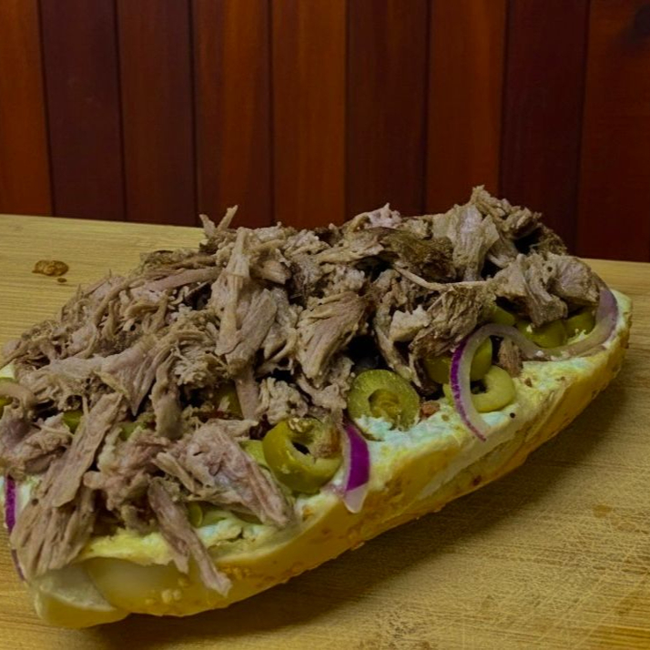 Pão, 4 carnes de picanha 120g, queijo, presunto, cheddar, calabresa, bacon, maionese de alho, barbecue, 4 aneis de cebola, requeijão e batata palha