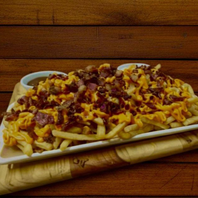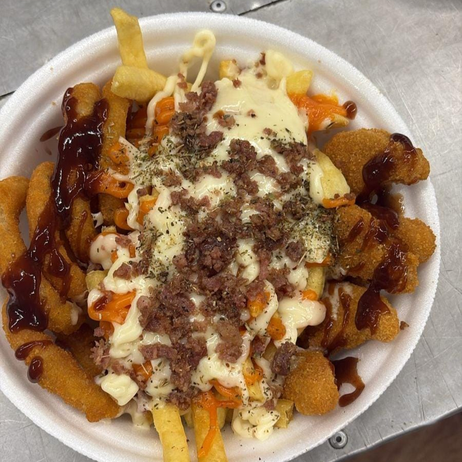 Batata frita, queijo, orégano, alho torrado, cheddar, requeijao, bacon, calabresa, 5 anéis de cebola e 5 nugget