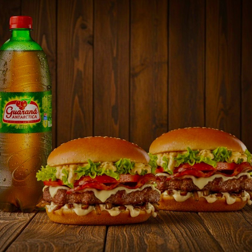 2 Hambúrgueres ( Pão, Carne, Salada, Ovo, Cheddar, Requeijão, Maionese de Alho e Batata Palha) + Batata (Bacon, Calabresa, Cheddar e Orégano) + 1l