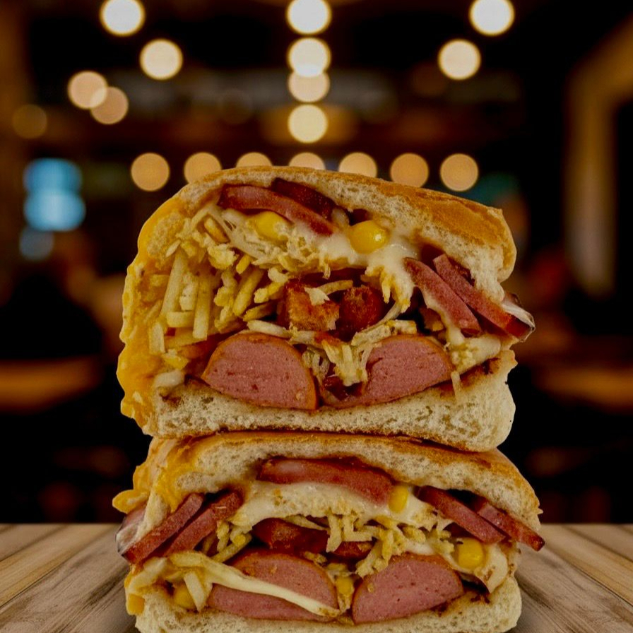Pão, Carne, Cheddar, Bacon, Calabresa, Ketchup, tomate , cebola, alface , requeijão, maionese de alho e batata palha