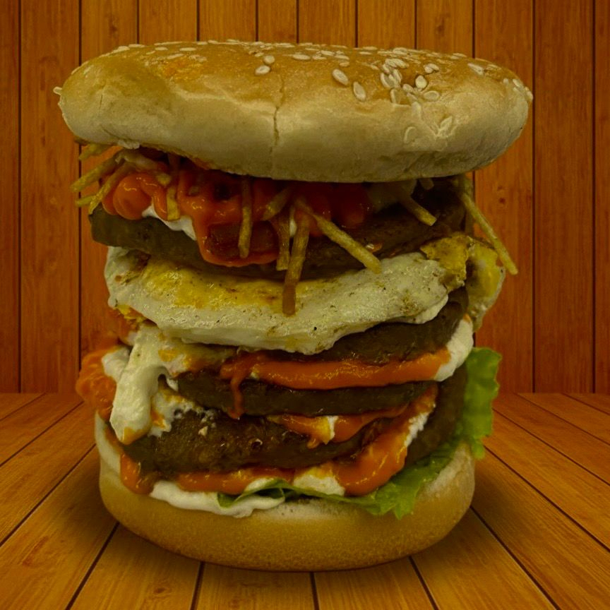 Pão, 2 carnes, presunto, queijo, ovo, maionese de alho, billy jack, cebola crispy, batata palha, salada e requeijão