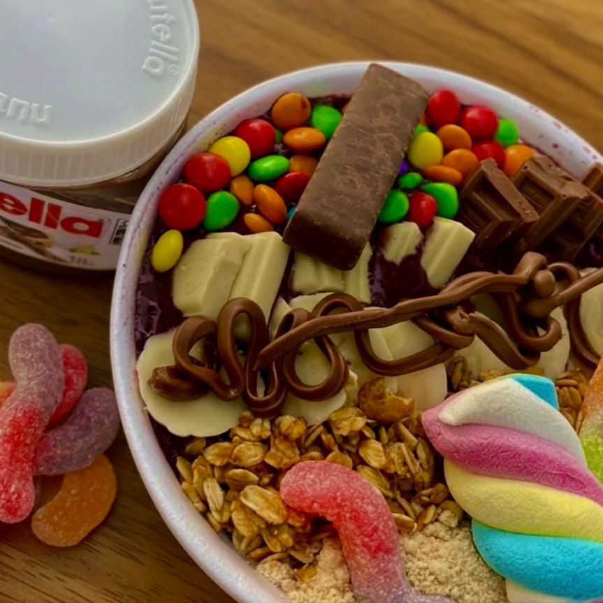 Calda Chocolate, Morango , leite condensado Frutas banana , kiwi, manga Porções especial Nutella , pistache, gotas de chocolate, bis branco e preto , marshmallow Completos Leite em pó , granola , amendoim , aveia , paçoca , jujuba , confete