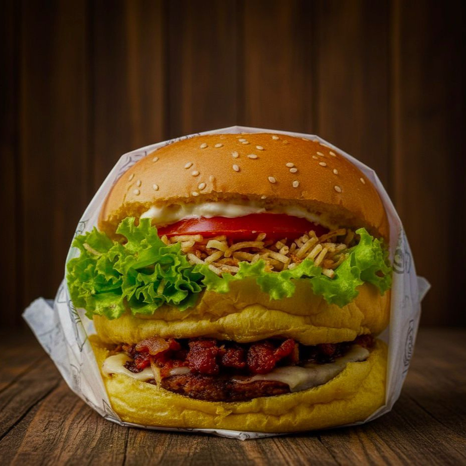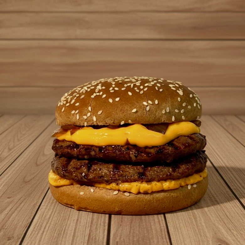 Pão, 2 carnes, cheddar, bacon, barbecue, maionese alho, cebola cripy, requeijão e batata palha