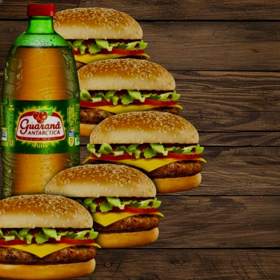 6 Hambúrgueres ( Pão, Carne, Salada, Ovo, Cheddar, Requeijão, Maionese de Alho e Batata Palha) + Batata (Bacon, Calabresa, Cheddar e Oregano 2l