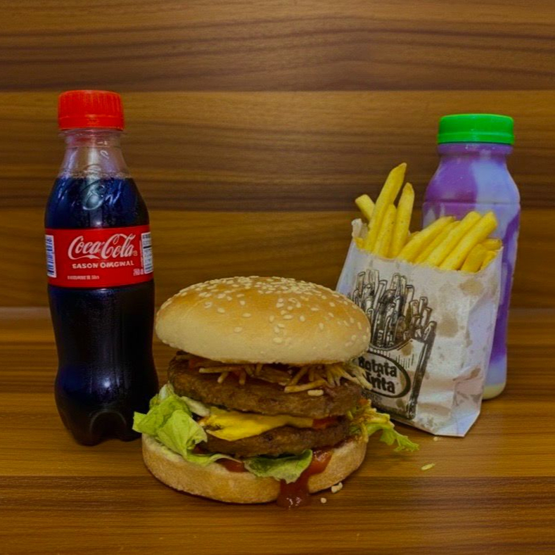 4 Burguers( Pão, Carne, Salada, Ovo, Cheddar e Presunto) + Batata (Bacon, Calabresa, Cheddar e Orégano) 2l