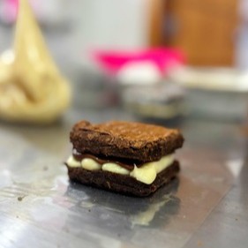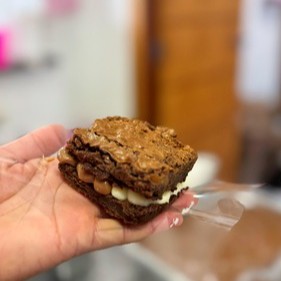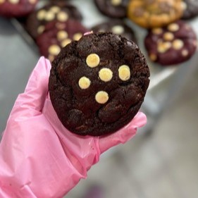 Massa cookie de chocolate, recheada com brigadeiro cremoso de ninho e nutella pura.