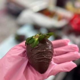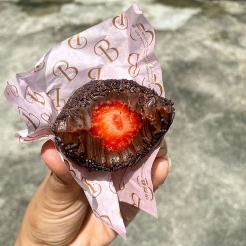 Bombom com um morango fresco, envolto por brigadeiro de ninho e uma casquinha de chocolate.