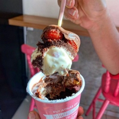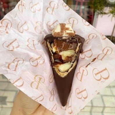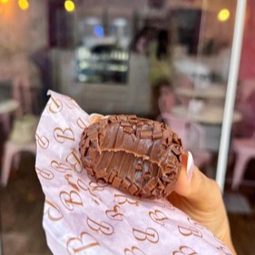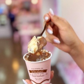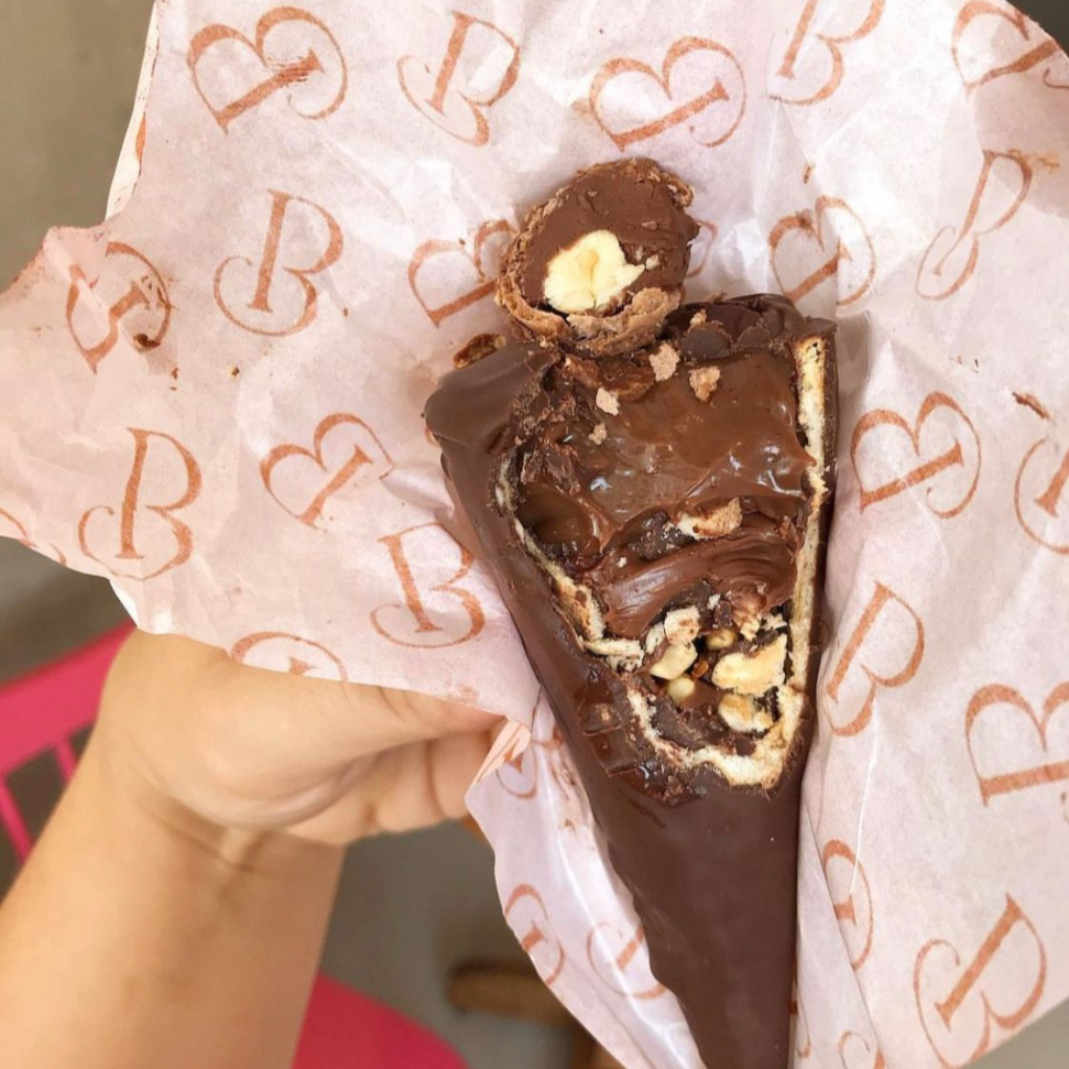 casquinha de sorvete banhada no chocolate meio amargo, recheado com brigadeiro de leite ninho e nutella