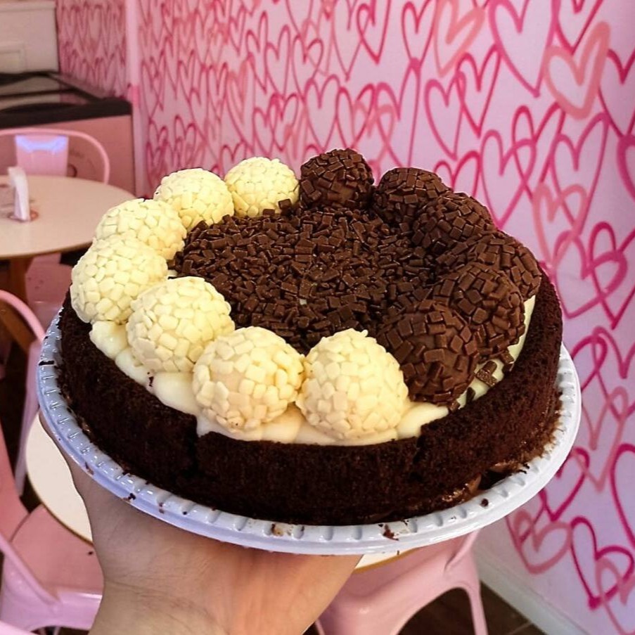 Massa branca, cobertura de brigadeiro de ninho e nutella.