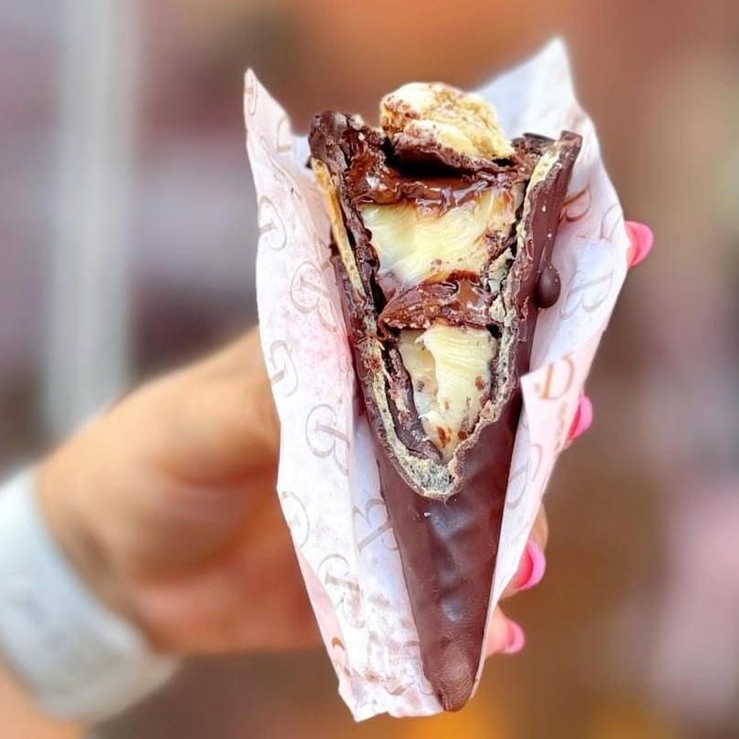 casquinha de sorvete banhada no chocolate meio amargo, recheado com brigadeiro, avelã e nutella