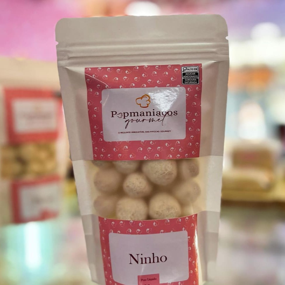 Pipoca caramelizada, cobertura branca e leite Ninho. 90g