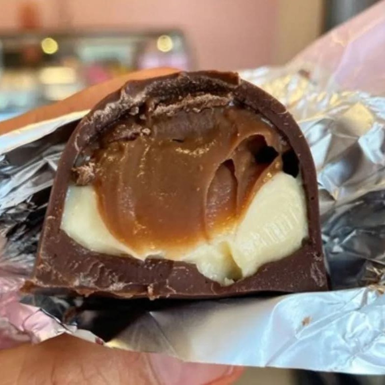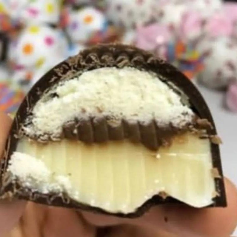 Casca de chocolate meio amargo, recheado de brigadeiro de leite Ninho e brigadeiro de chocolate.