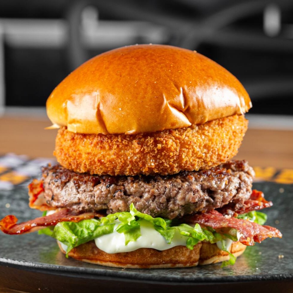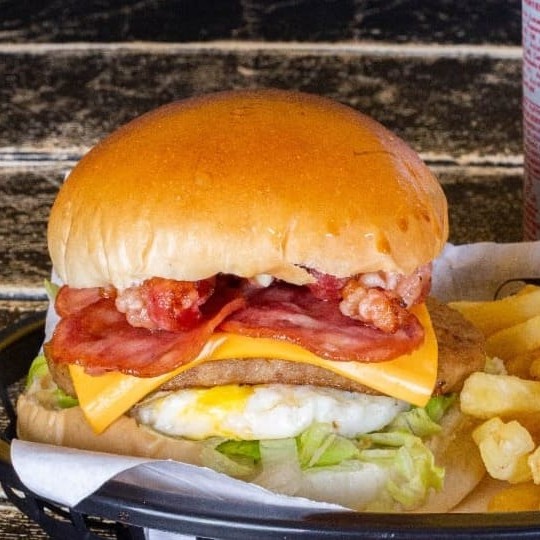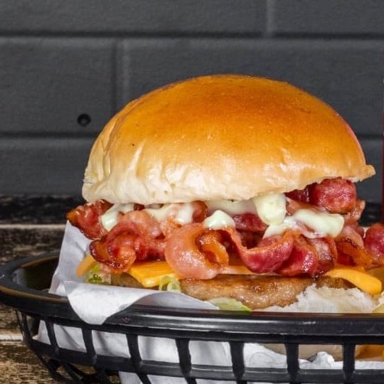 Delicioso hambúrguer com carne saborosa, queijo derretido, calabresa defumada , bacon crocante, ovo frito, maionese especial e fresca salada, tudo entre um pão de brioche macio. Uma explosão de sabores numa só mordida!