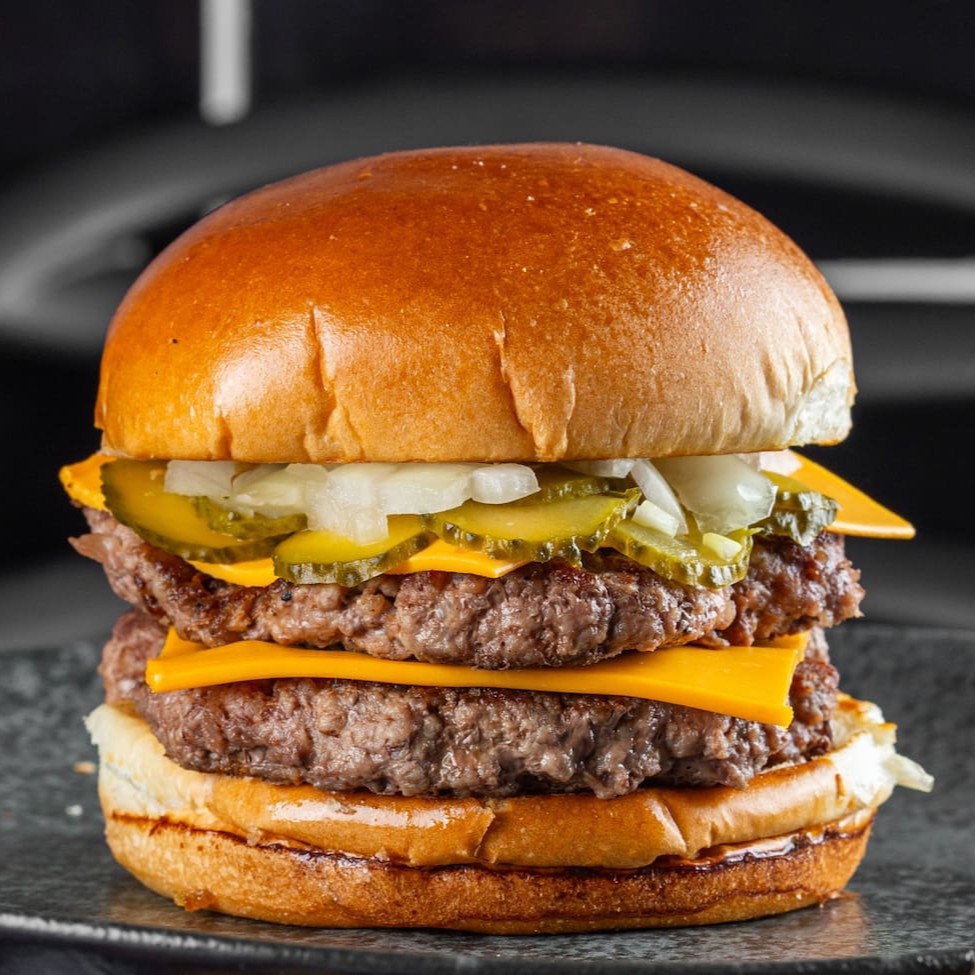 Delicioso Burguer servido no Pão Brioche, duas carnes de 110g, Queijo Cheddar, cebola e picles.